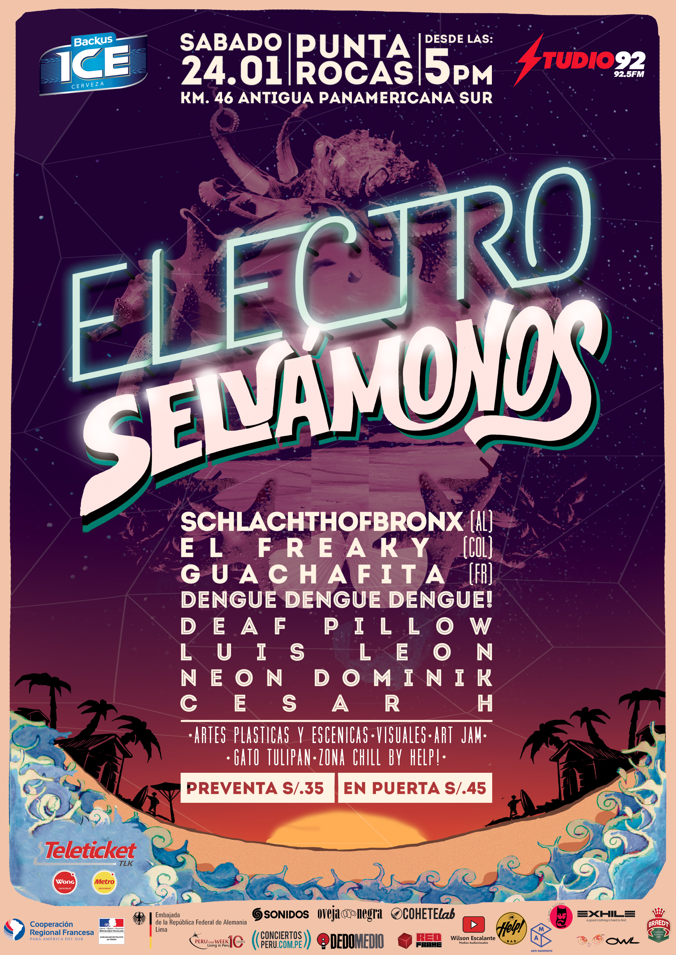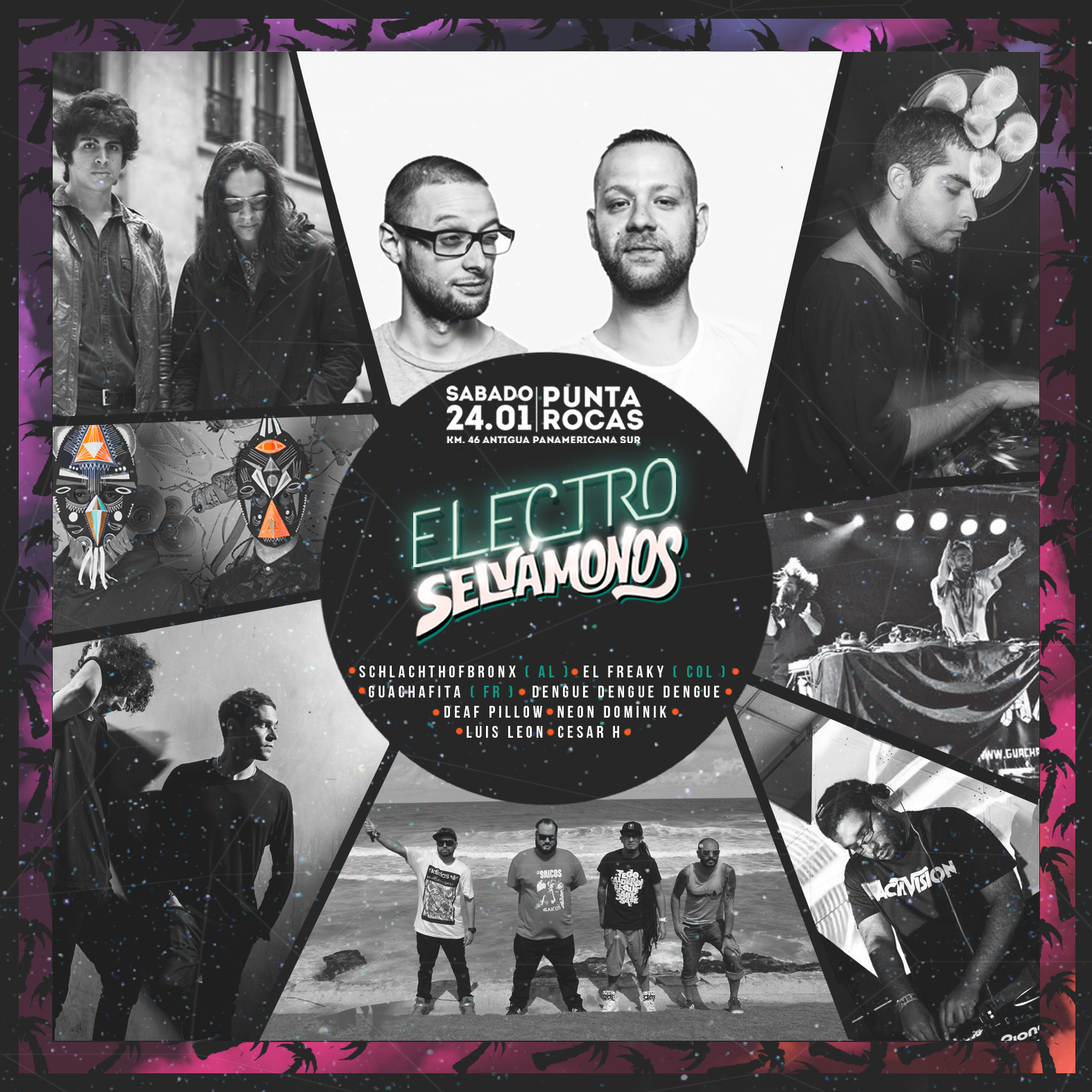 Selvámonos, siempre buscando lo más destacado de las músicas locales, ha invitado a Deaf Pillow, Dengue Dengue Dengue!, Neon Dominik (live), Luis Leon, y Cesar H a representar a la escena limeña en esta edición 2015 del Electroselvámonos.