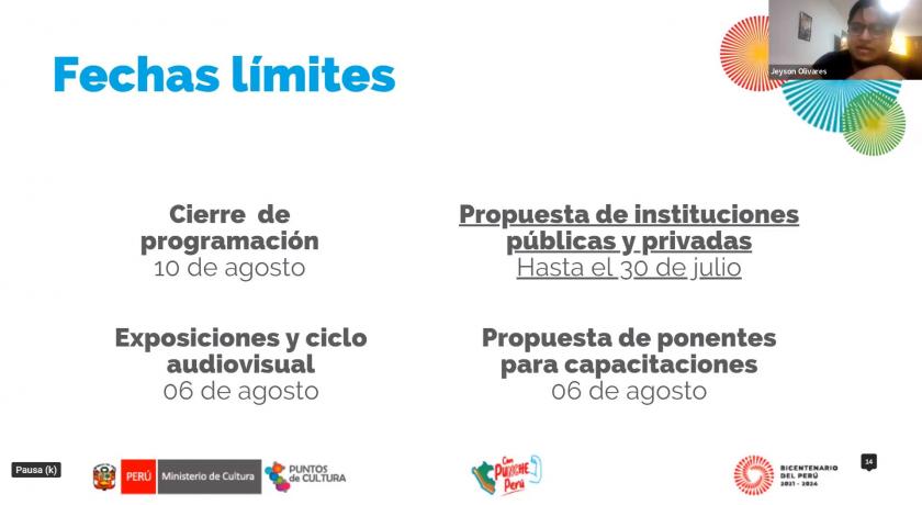 Desde el 13 de julio en que se realizó la primera mesa de trabajo dedicada a recoger las propuestas de las organizaciones con respecto a la mejor manera de implementar el Mes de los Puntos de Cultura, hasta el 1° de Setiembre en que se llevó a cabo su inauguración, fueron numerosos los espacios de diálogo y mesas de trabajo realizados. La característica de todos estos encuentros fue la voluntad de los participantes por contribuir desde su experiencia y posibilidades al mejor logro de los objetivos planteados: la visibilización del impacto de la labor de las propias organizaciones comunitarias reconocidas como Puntos de Cultura en todo el país. Fueron un total de 5 mesas de trabajo con los Puntos de Cultura de Lima, y 5 mesas de trabajo con los Puntos de Cultura de Regiones en las cuales se fueron perfilando y definiendo de manera articulada las acciones a realizar. Adicionalmente se realizaron también diversos espacios de trabajo con grupos decisores que le dieron forma también a acciones específicas como Encuentro con los gobiernos locales, las Charlas de intercambio de experiencias de los Puntos de Cultura, la Muestra fotográfica y comunitaria, el ciclo audiovisual, entre otros.